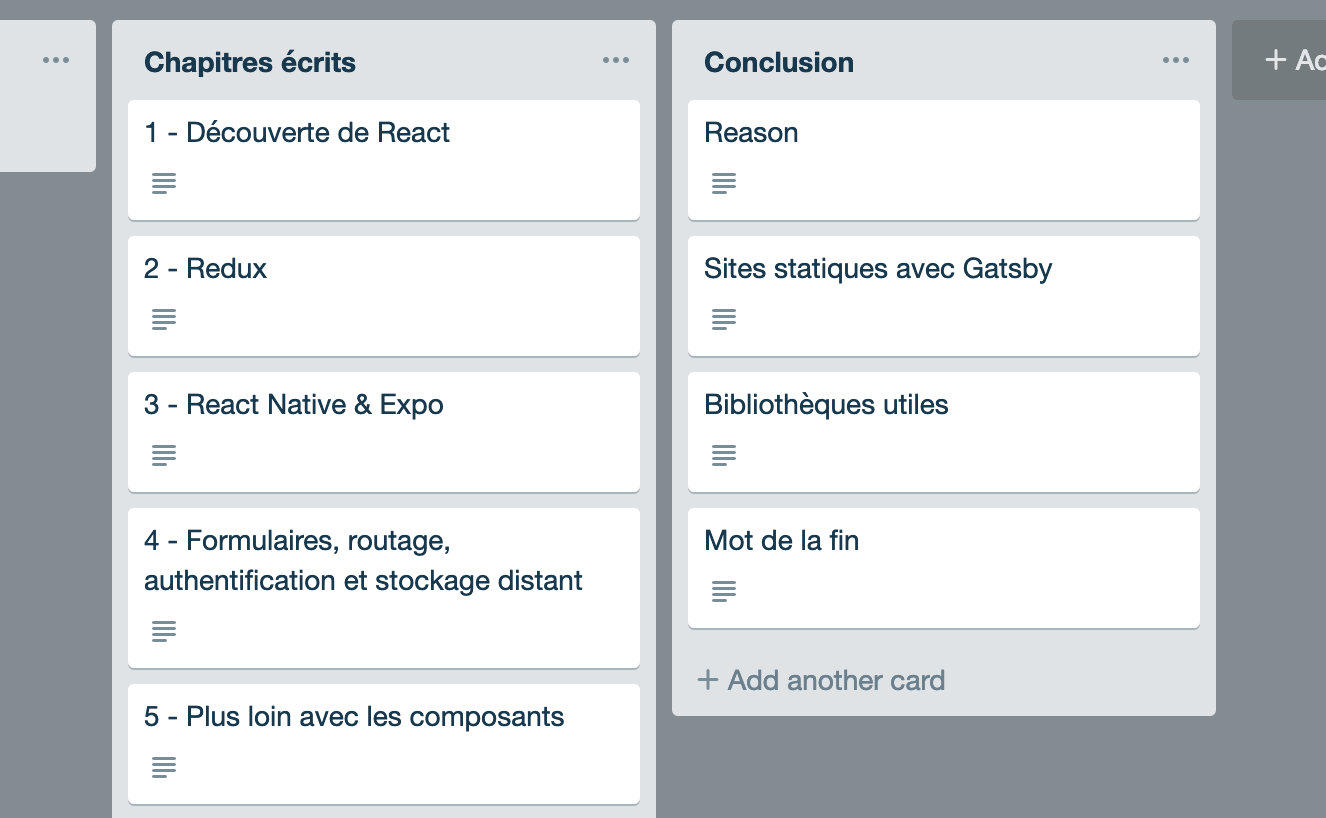 At start it was an easy question to answer: I wanted to write a first chapter about React basics (components, state, JSX, etc.), a second one about Redux, and a third one about React Native and Expo. But for the next ones it wasn’t that easy.