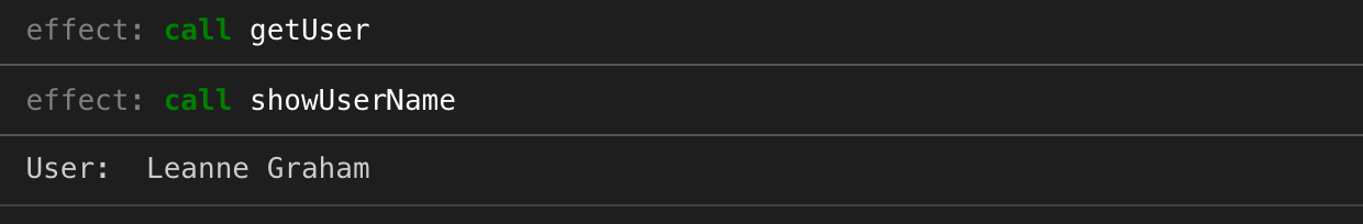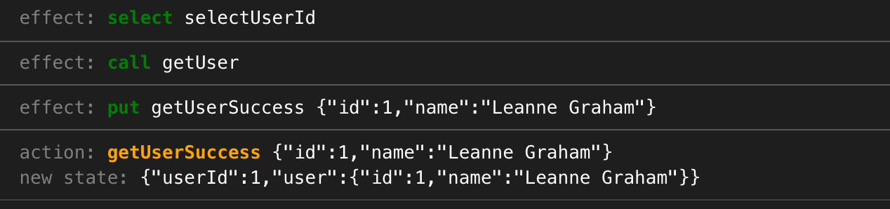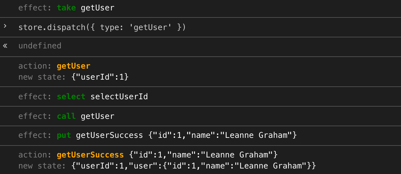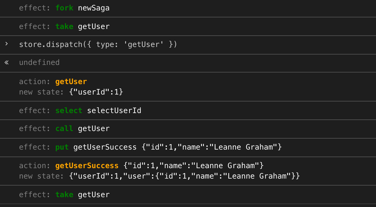 It works well, and don’t be afraid it’s not actually the kind of infinite loops we tend to forbid, it’s just an infinite iterator. The saga will never terminate, but the content of the loop will be executed only once per “getUser” action dispatched.
